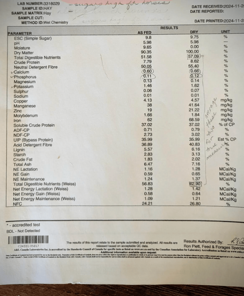TDN tells us how calorie-dense the hay is — how much usable energy animals can extract. Energy determines: body condition maintenance; warmth and resilience in winter (so important in Canada and at elevation!); lactation output; whether animals hold, gain or slide backwards.