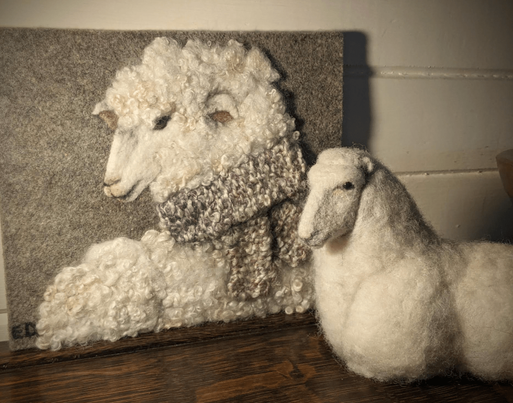 Fleeces at the homestead! From top left — Banjo on the boards with Alex; Castor’s first fleece, cut-side up; Amy, looking a little fuzzy; Banjo on the left beside Levon, two distinct fleece “styles” in my flock; needle felting locks and figures from Erin Davis at Hawthorn Studios; weaving samples from Traceable Textiles in Edmonton using fleece from the homestead.