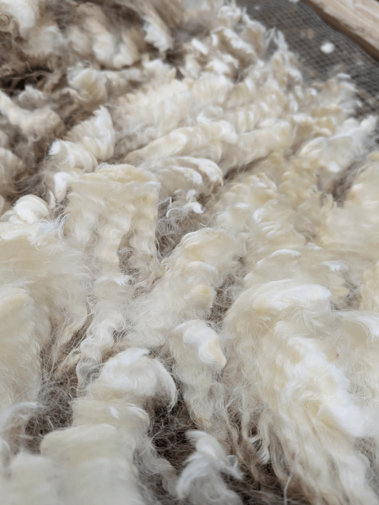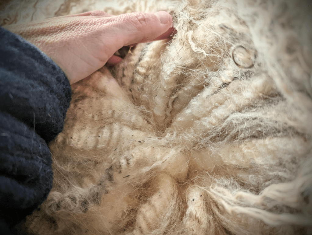 A good fleece — any good fleece — starts with health. It should come off in one piece, like a blanket. That tells you the sheep was shorn cleanly and the fibre has grown with consistency. When you lift a lock from the centre (not the outer edge), it should hold together in a distinct “staple” — the length of fibre grown over the year, from cut end to purled tip. Give it a tug. It should feel resilient. Not brittle. Not papery. Look for consistency from one end of the lock to the other.