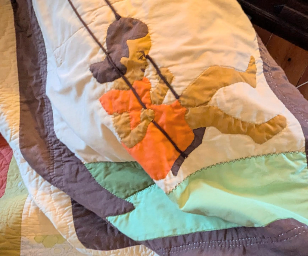 The quilt my Gramma made for me. Yes, that’s me on my swing, based on a photograph. . . my dress on the quilt is made from the same fabric as the dress I was wearing in the photo. Alice was an artist.