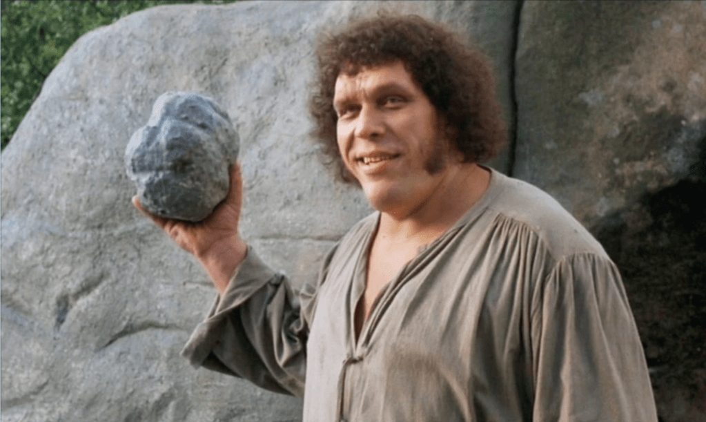 When Fezzik stepped out from behind the rock, the Man In Black took one look at his opponent and gulped. You could see the mismatch, in his baggy pants and wide belt, his head as massive as a lion’s and a bouncing a boulder in his catcher’s mitt of a hand, Fezzik towered over the Man In Black. At first, the battle — “sportsmanlike, as God intended” — went very much the way you’d expect. The Man In Black hit Fezzik as hard as he could in the belly and Fezzik didn’t even flinch, “I want you to think you are doing well!”